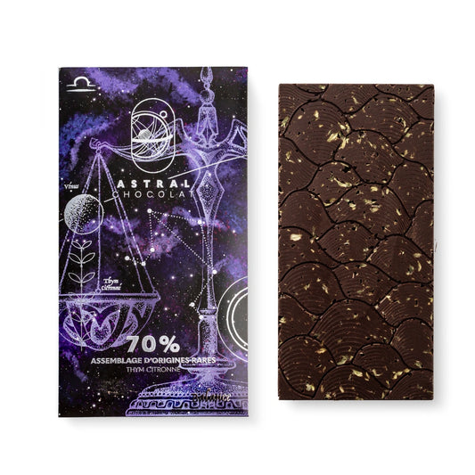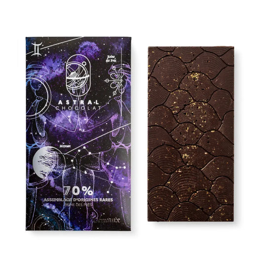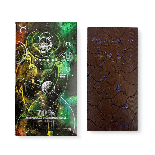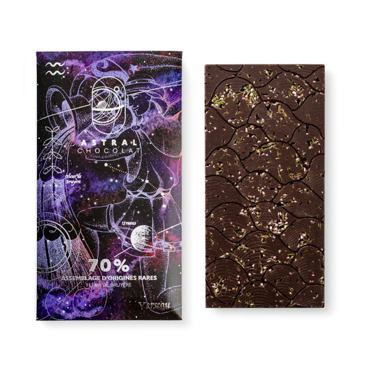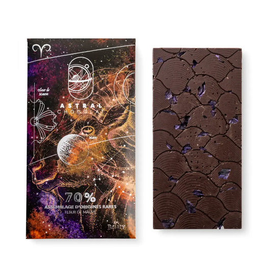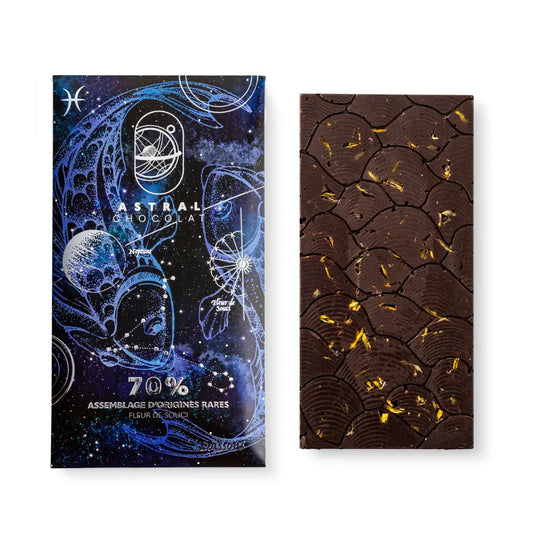 Chaque chocolat noir est orné d'une plante ou fleur cultivée pendant la période de ton signe, pour un cadeau unique et personnalisé. Offrir (ou s’offrir) une tablette Astro, c’est faire plaisir avec du sens, du goût, et une touche de magie !