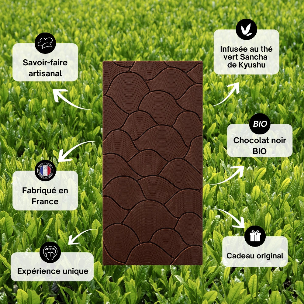 Savourez notre chocolat noir bio 75%, sublimé par l'élégance du thé vert Sencha de Kyūshū. Un mariage unique de cacaos rares et de thé japonais, qui offre des notes iodées et sucrées de fruits rouges, pour une expérience gustative raffinée et inoubliable.