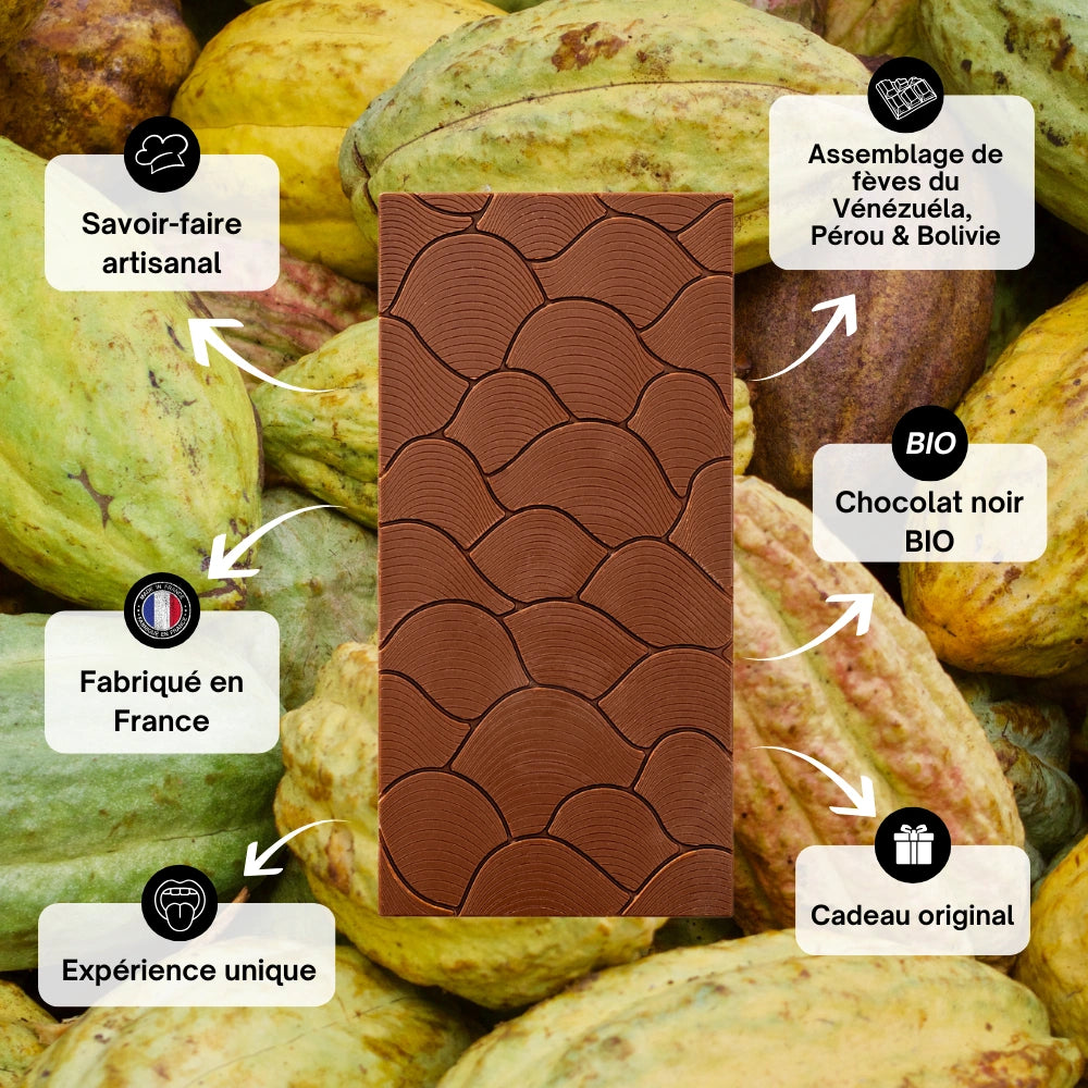 Nous retrouvons principalement des fèves de Bolivie, cultivées dans la province de Beni, qui offrent des notes maltées et miellées, avec une touche subtilement épicée et vanillée. Celles du Pérou, issues du parc naturel Río Abiseo, révèlent une intensité fruitée marquée par des notes de fruits rouges et une acidité délicate. Enfin, les fèves du Venezuela, cultivées dans la péninsule de Paria, apportent un équilibre parfait entre puissance chocolatée et notes boisées.