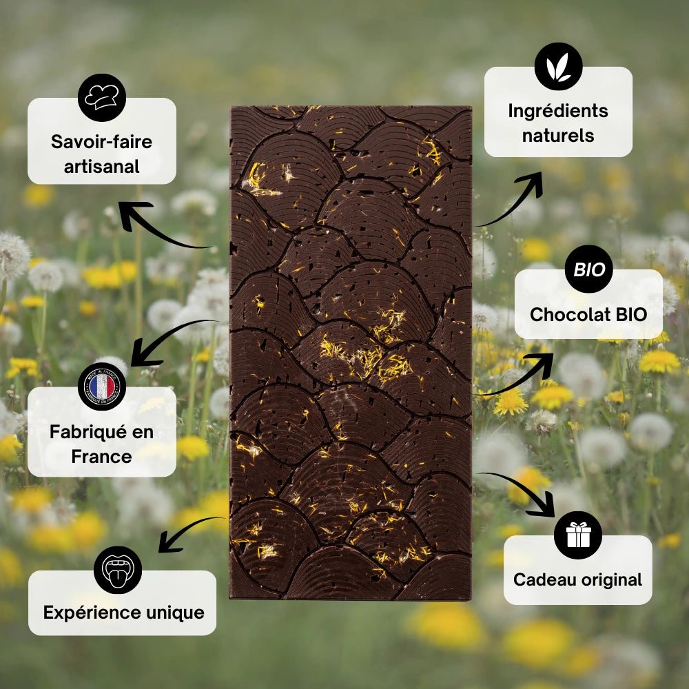 Découvrez notre chocolat noir 70%, sublimé par le pissenlit reproduit en été. Une symphonie de saveurs qui évoque la douceur et la fraîcheur de votre signe.