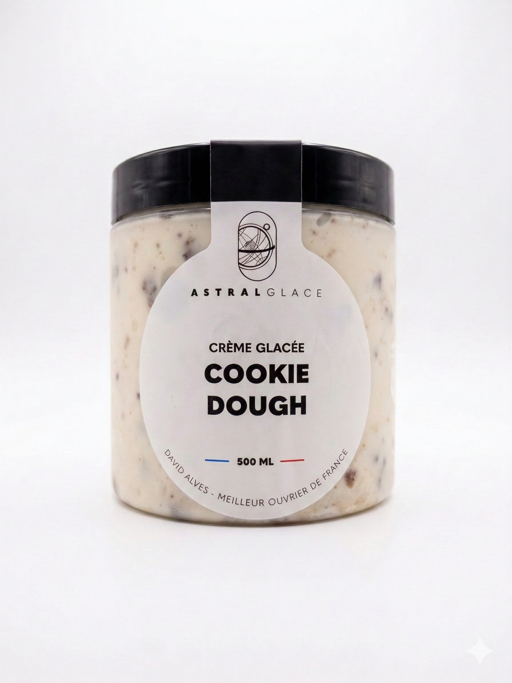 Pot de 500mL de Crème glacée Cookie Dough réalisée par David Alves, Meilleur Ouvrier de France Glacier 2023.