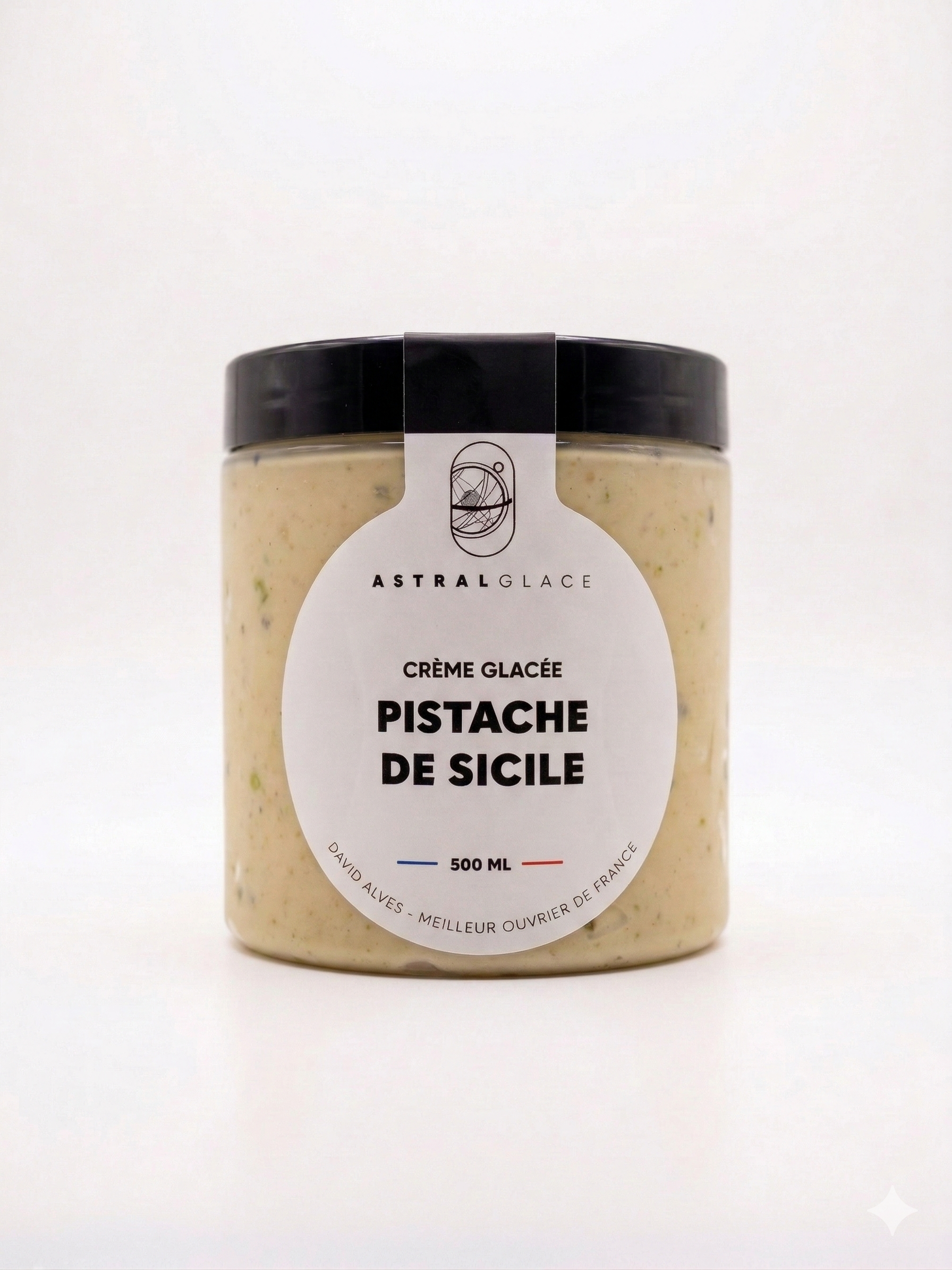 Pot de 500mL de Crème Glacée Pistache de Sicile réalisée par David Alves, Meilleur Ouvrier de France Glacier 2023.