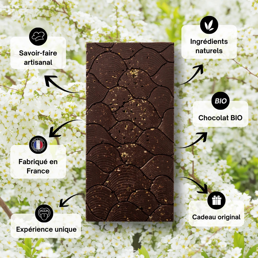 Découvrez notre chocolat noir 70%, sublimé par la reine des prés récoltée au printemps. Une symphonie de saveurs qui évoque la douceur et la vivacité de votre signe.