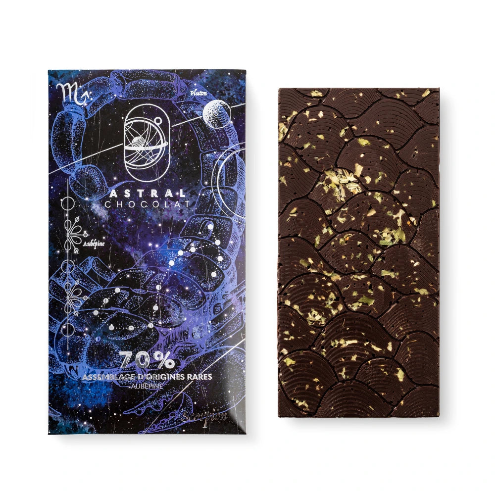 Découvrez notre chocolat noir 70%, sublimé par l’aubépine récoltée en automne. Une symphonie de saveurs qui évoque la chaleur et la profondeur de votre signe.
