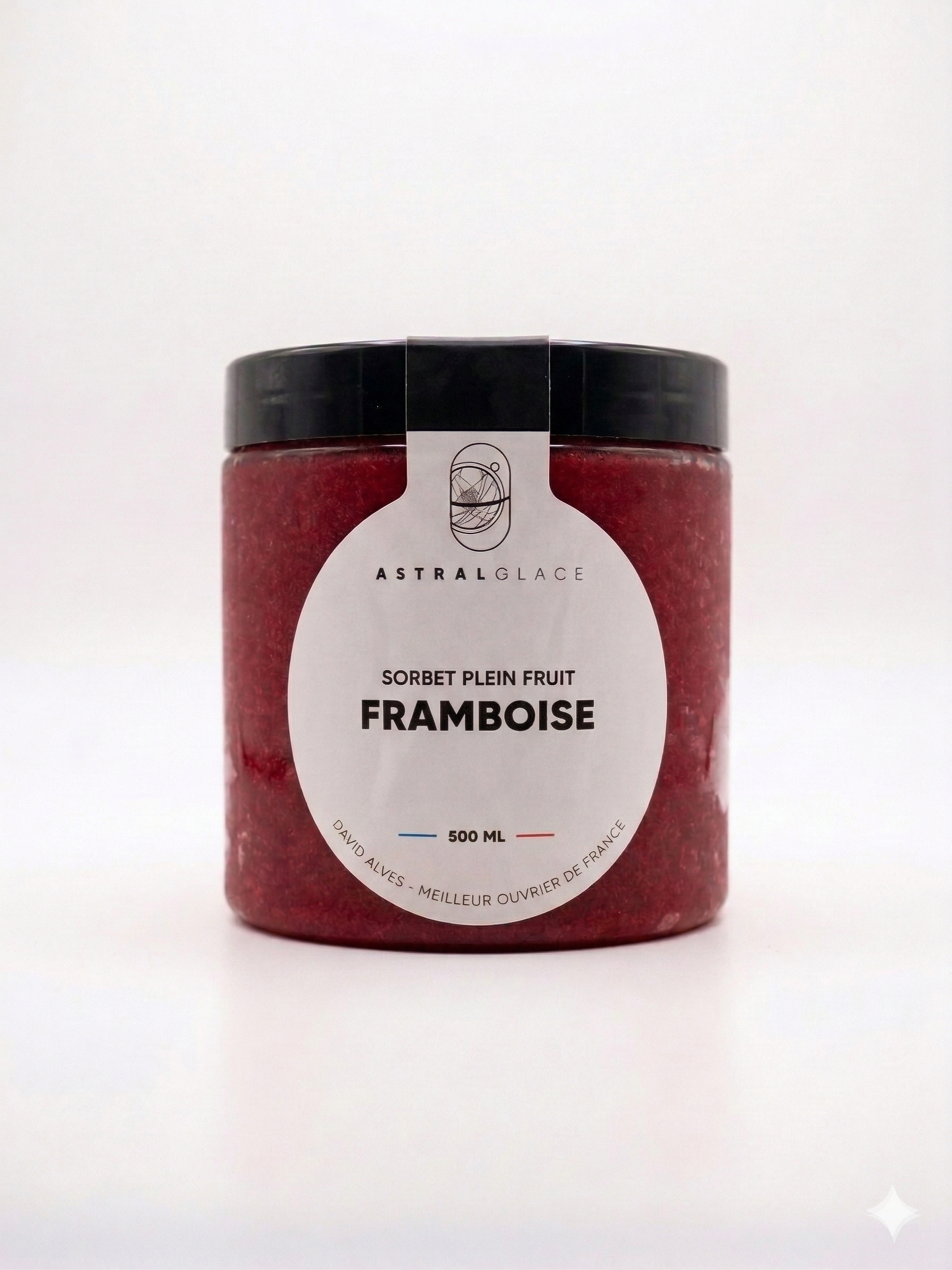 Pot de 500mL de Sorbet Plein Fruit Framboise réalisée par David Alves, Meilleur Ouvrier de France Glacier 2023.