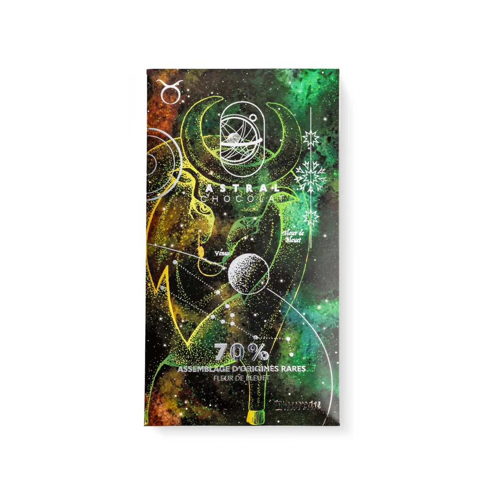 Découvrez notre chocolat noir 70%, sublimé par la fleur de bleuet récoltée à la mi-printemps. Une symphonie de saveurs qui évoque la subtilité et la fraîcheur de votre signe.
